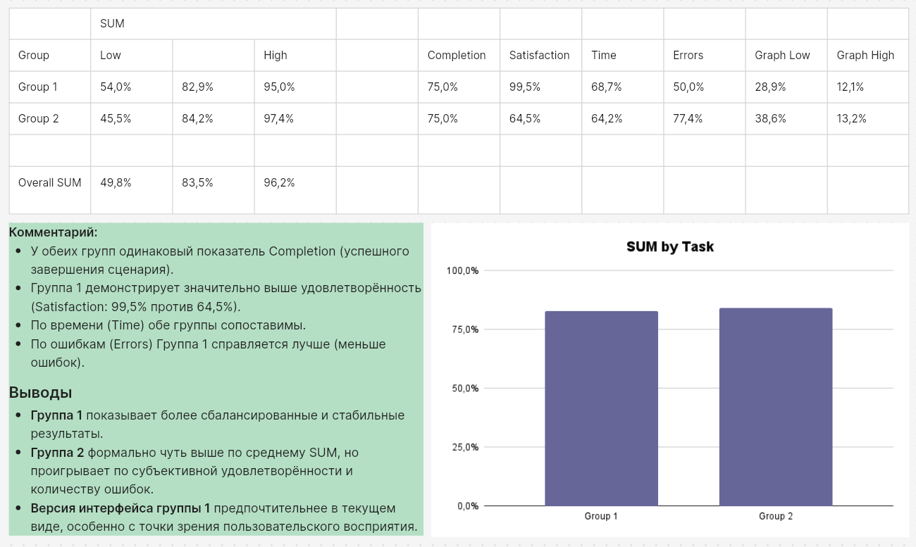 Уровень успешности оказался одинаковым, но по удовлетворённости вариант А оказался сильнее — именно его мы рекомендовали к внедрению.