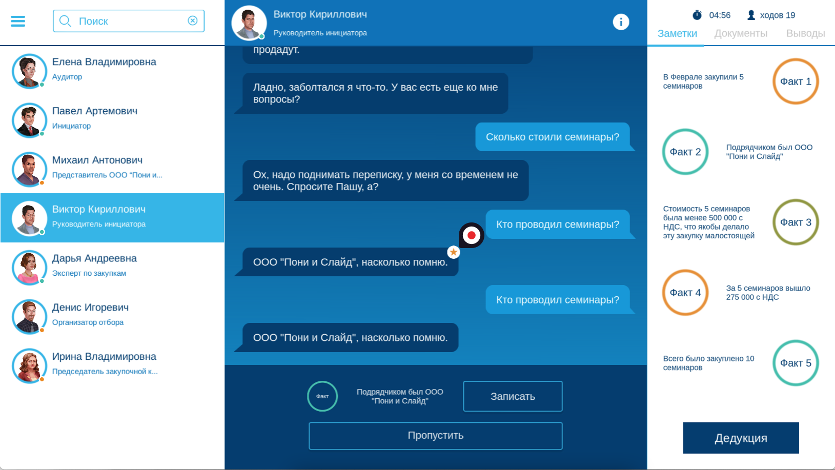 По ходу сюжета добавляются новые участники и факты, которые помогают восстановить цепочку событий. Когда накоплена достаточная информация, становится доступна функция «Дедукция», с помощью которой игрок может сделать вывод. Также доступны подсказки.