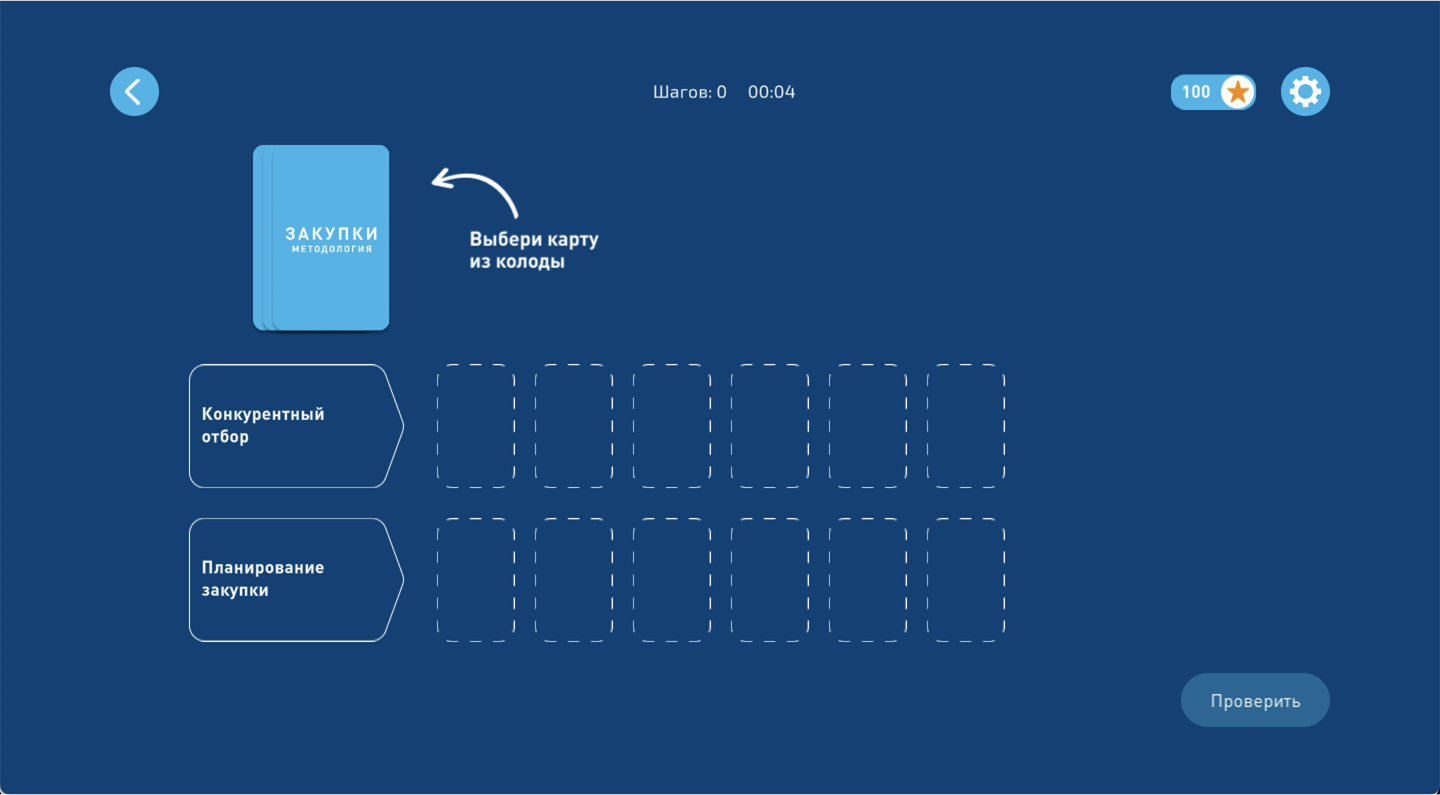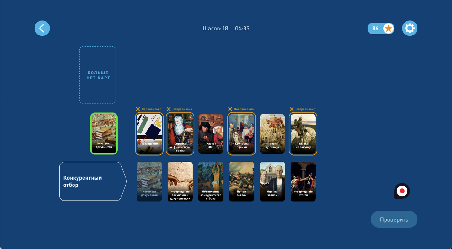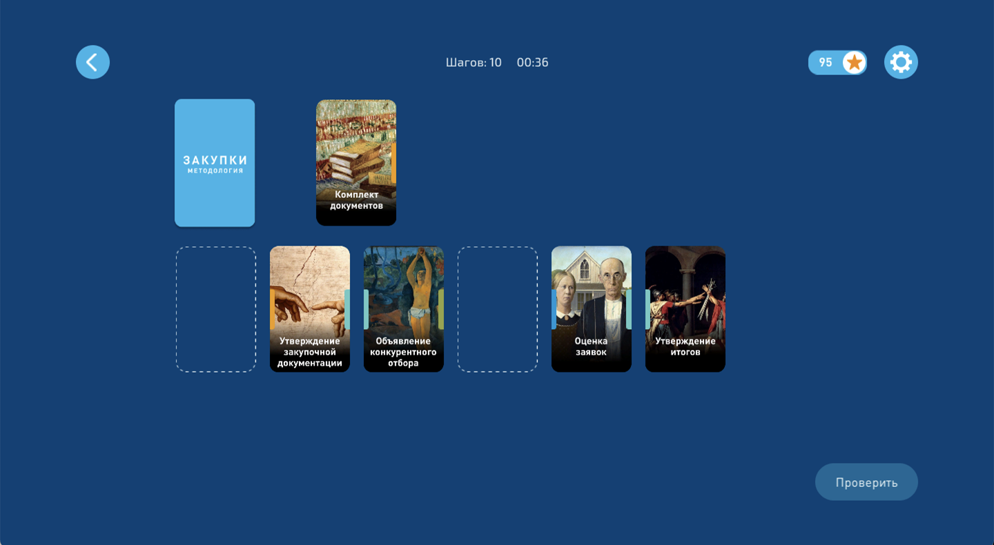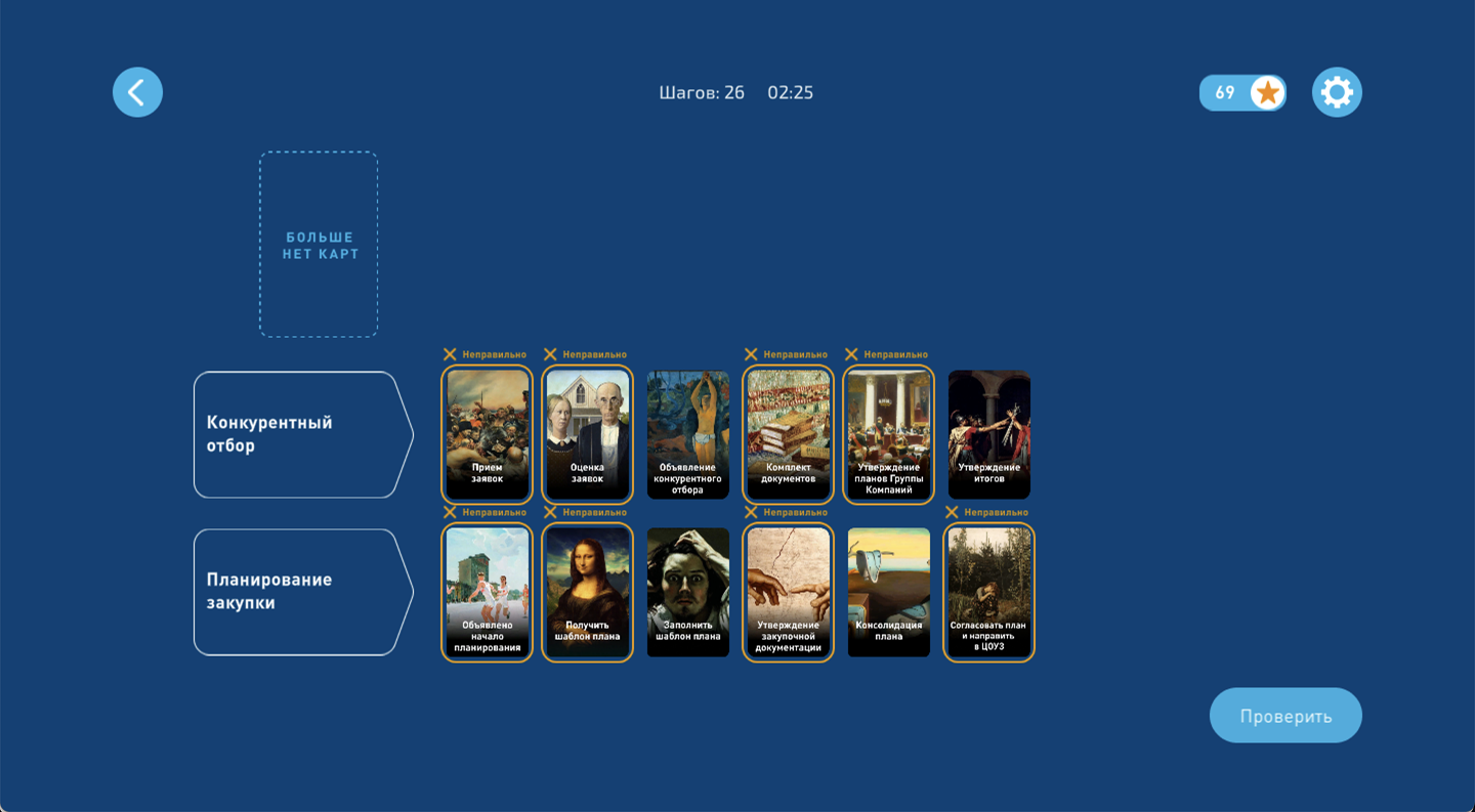 Механика игры стимулирует пользователей скорее расставить карточки в нужном порядке, не вникая в суть. Из-за этого теряется обучающий эффект — процесс не помогает закрепить понимание закупочных процедур.