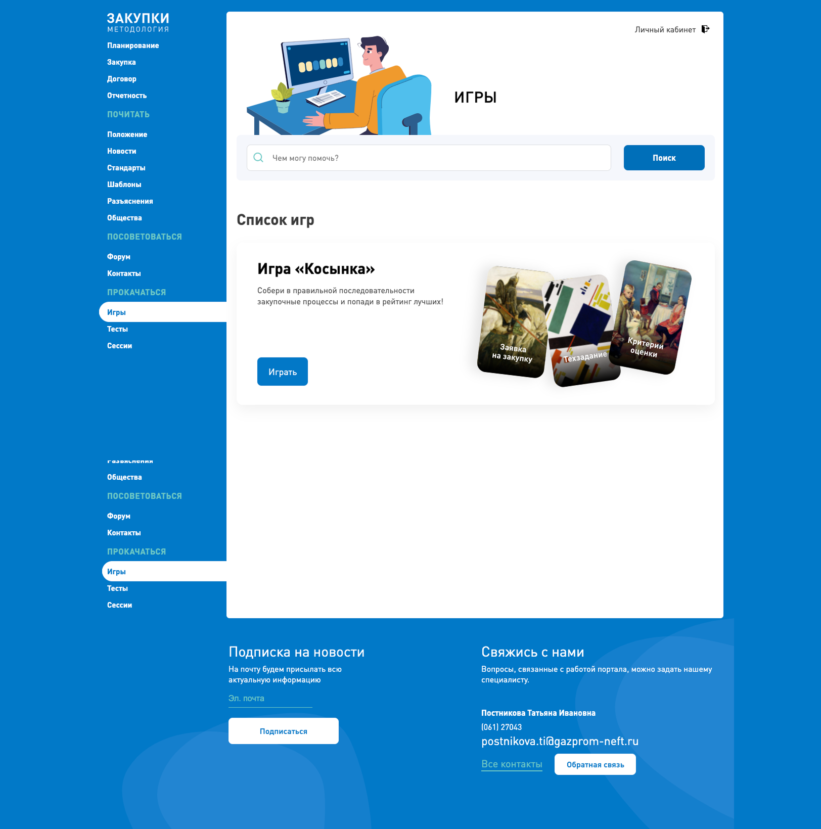 Это внутренняя игра, в которую могут играть все сотрудники «Газпром нефти», связанные с закупками. Её цель — помочь пользователям освоить закупочные процедуры и довести их выполнение до автоматизма. В игре три уровня: «Новичок», «Специалист» и «Эксперт» — каждый с собственной механикой.