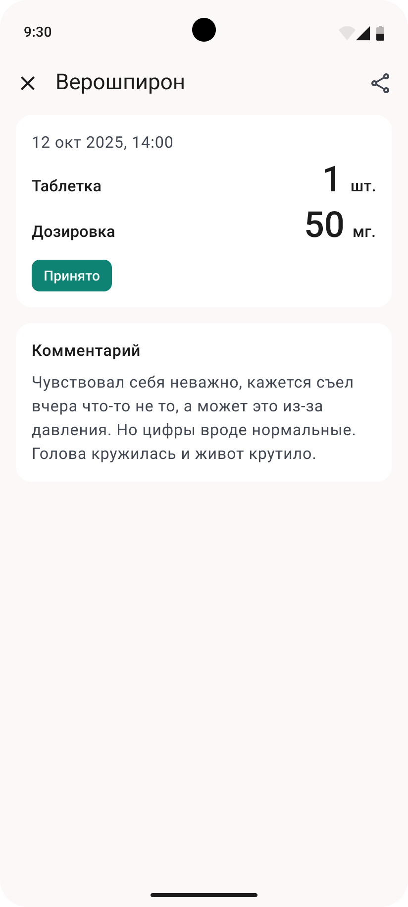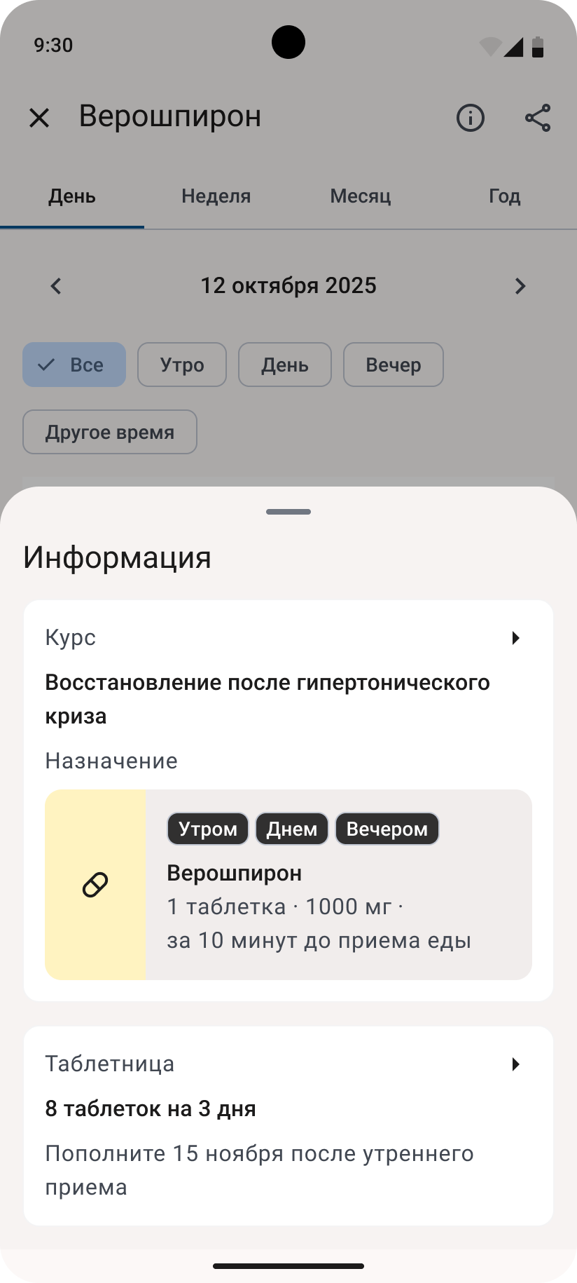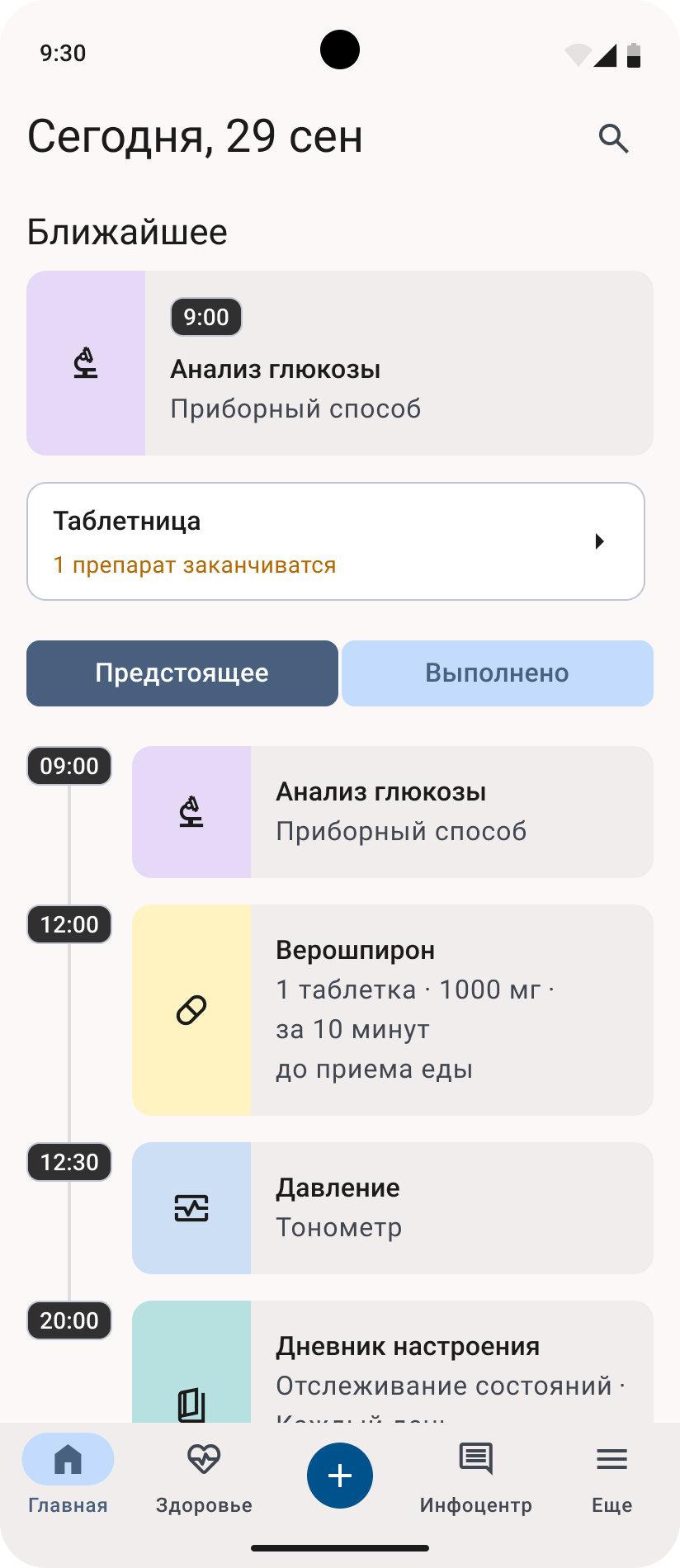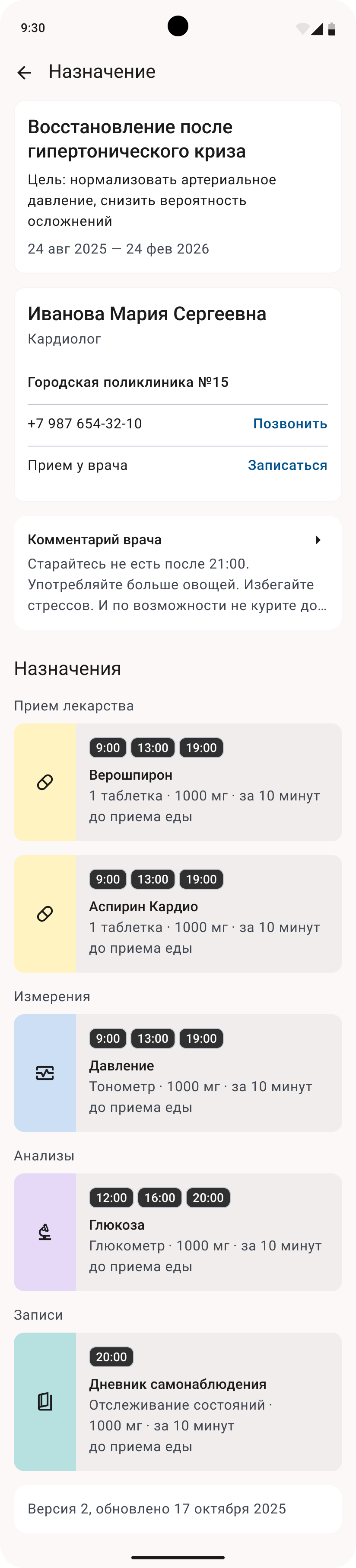 Чтобы решить задачу, мы много внимания уделили выявлению общих элементов и паттернов. Например, и у заполнения дневника, и у приёма лекарства есть много общего: время, последовательность действий, вписанность в курс, и то и то надо назначить, и там и там посмотреть историю.