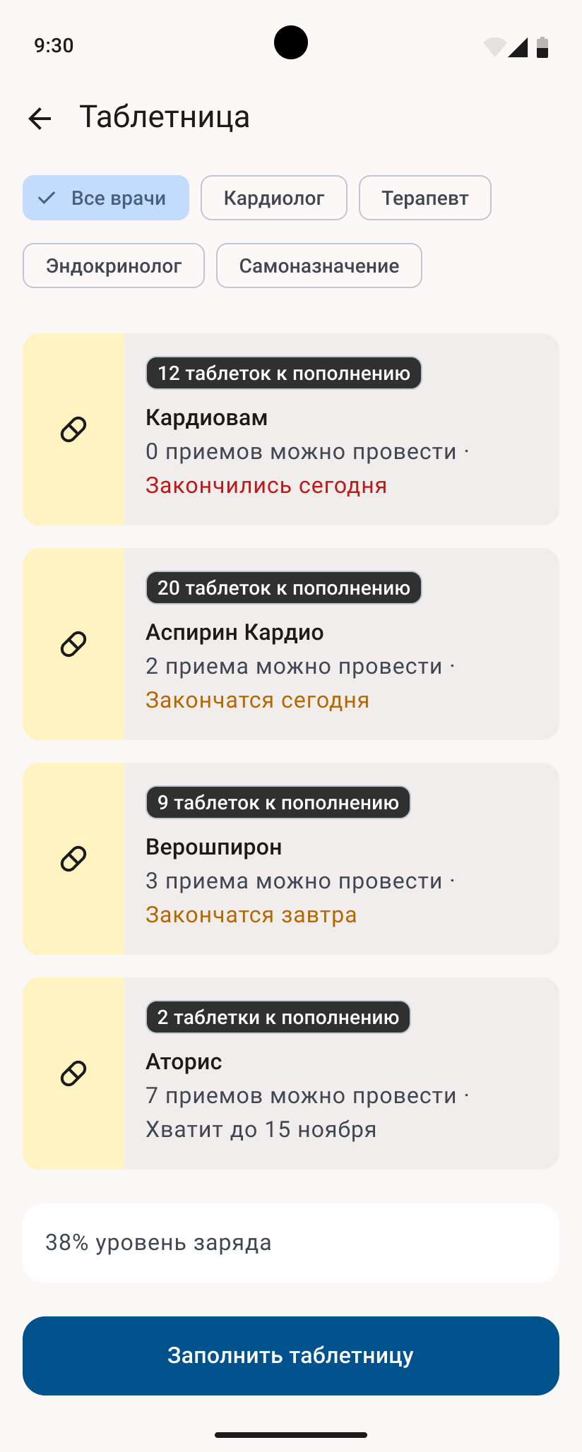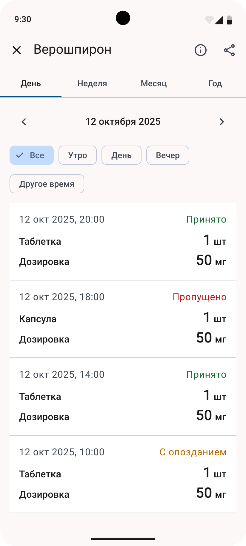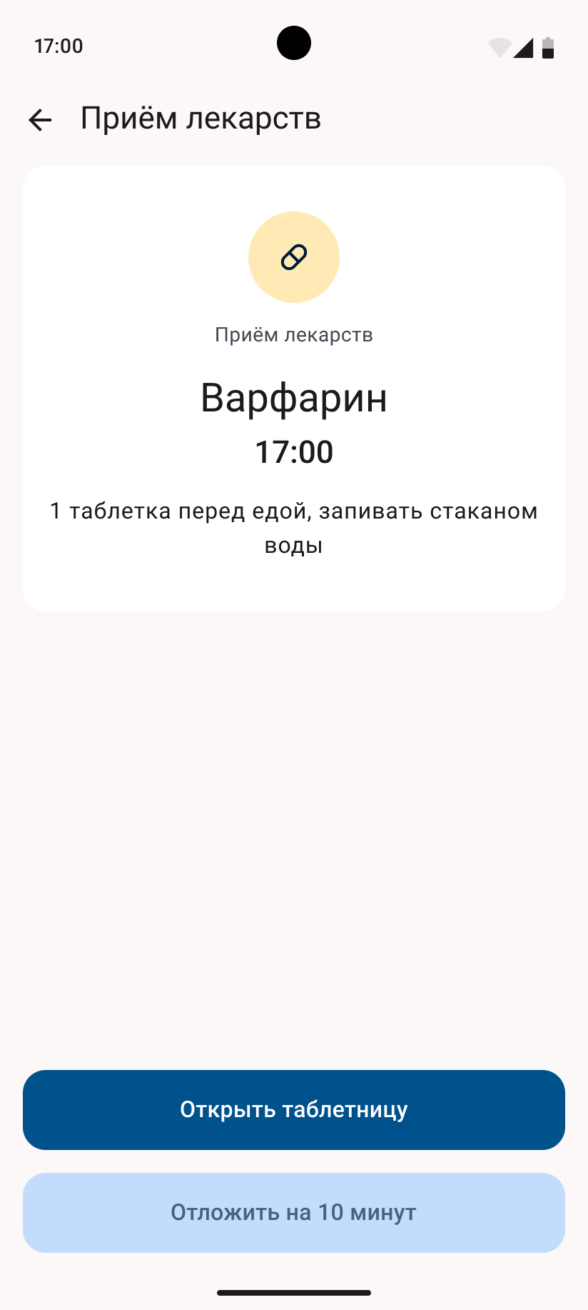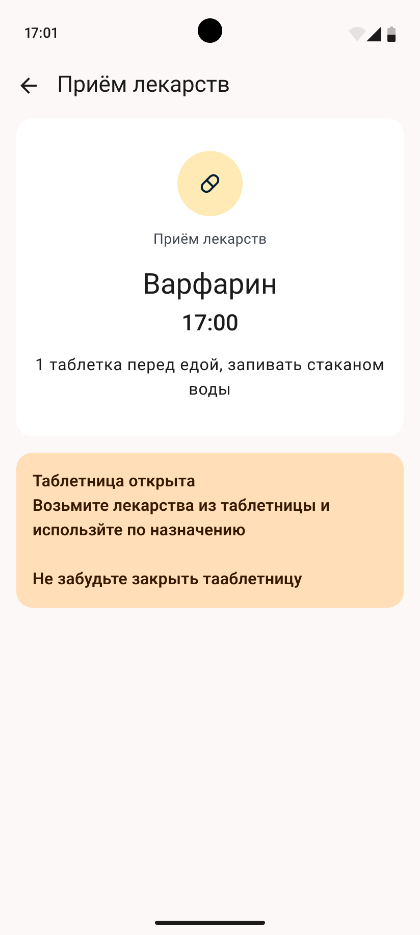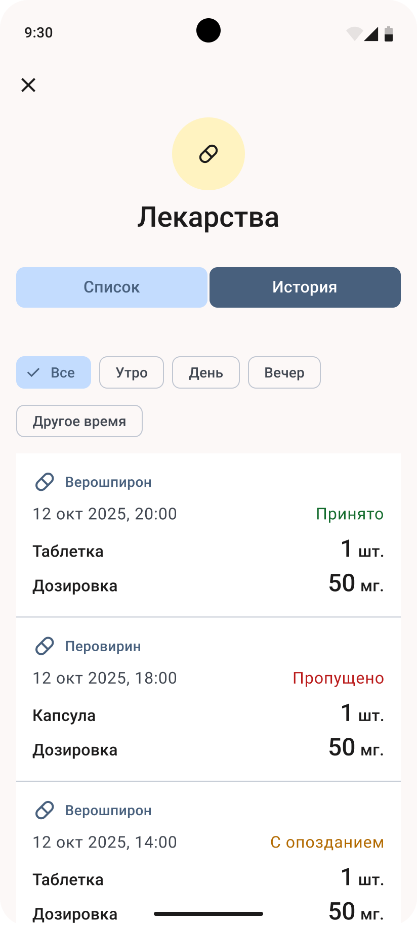 - Принять лекарство (несколько разных контекстов: по уведомлению/заблаговременно/позже срока, с автоматической таблетницей/без неё)