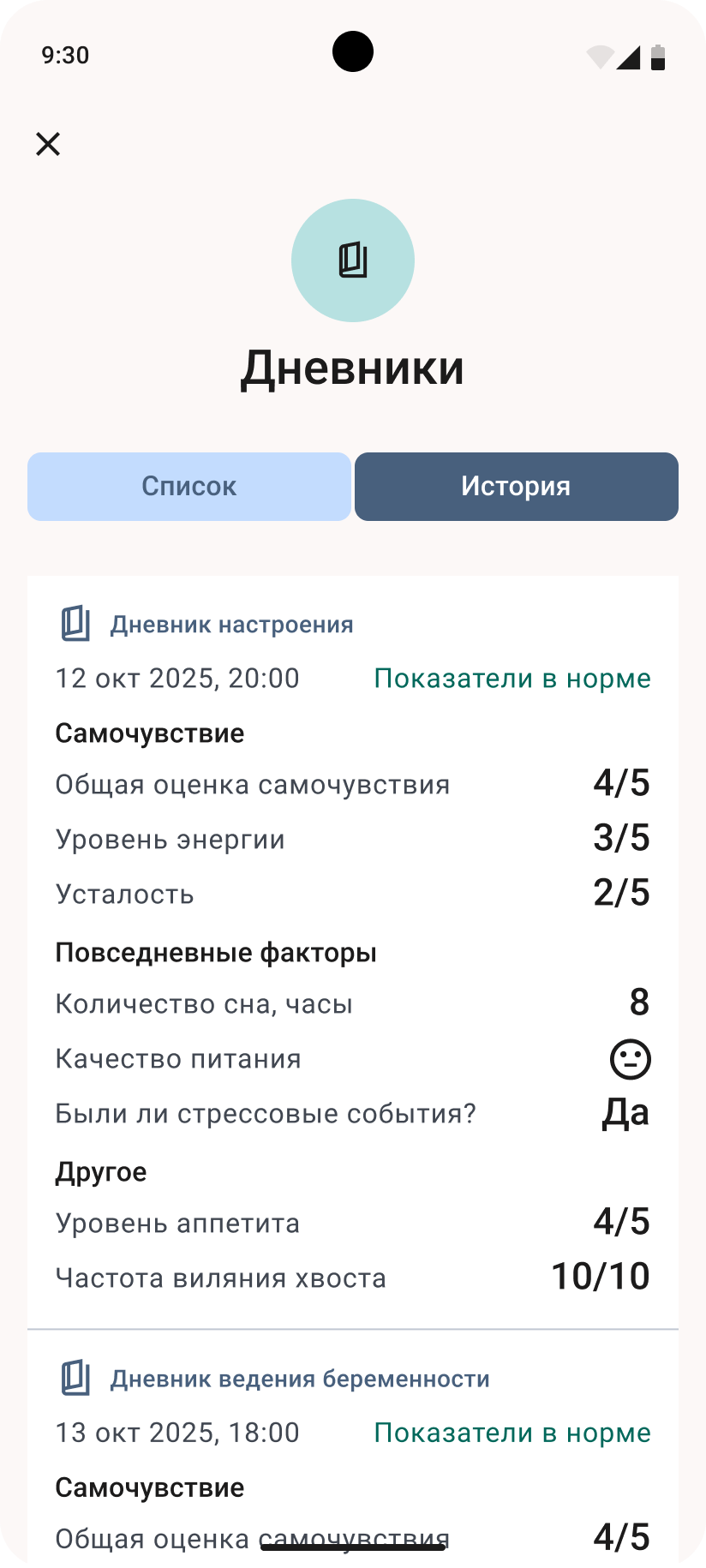 - Дневники (навигация). Детализация на примере дневника самочувствия.
