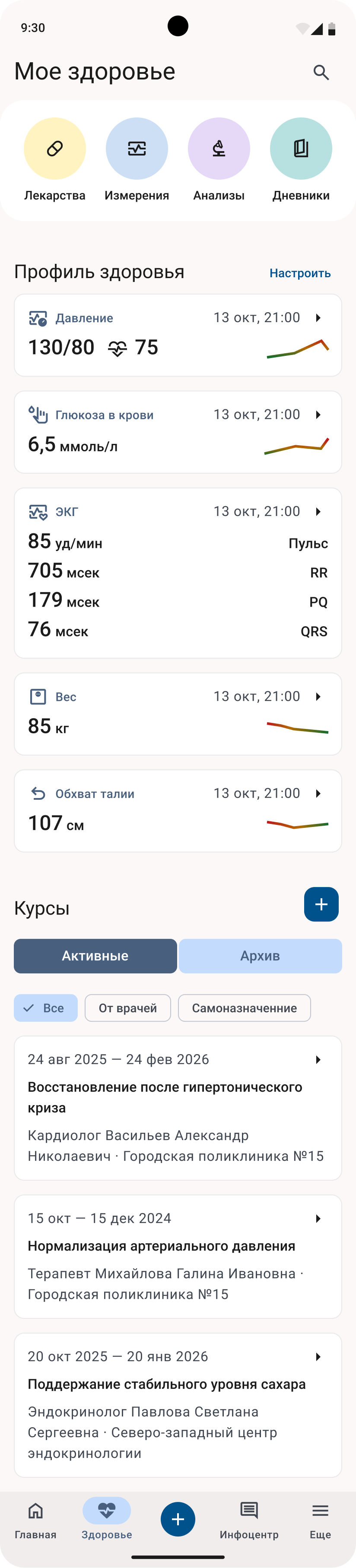 Для разных элементов продукта (лекарства, измерения, анализы, дневники, назначение/исполнение/просмотр истории) мы проектировали типовой многофункциональный элемент, и дальше на детализации показывали, как он адаптируется, где такой же а где отличается, в ситуациях измерения давления и измерения ЭКГ, например.