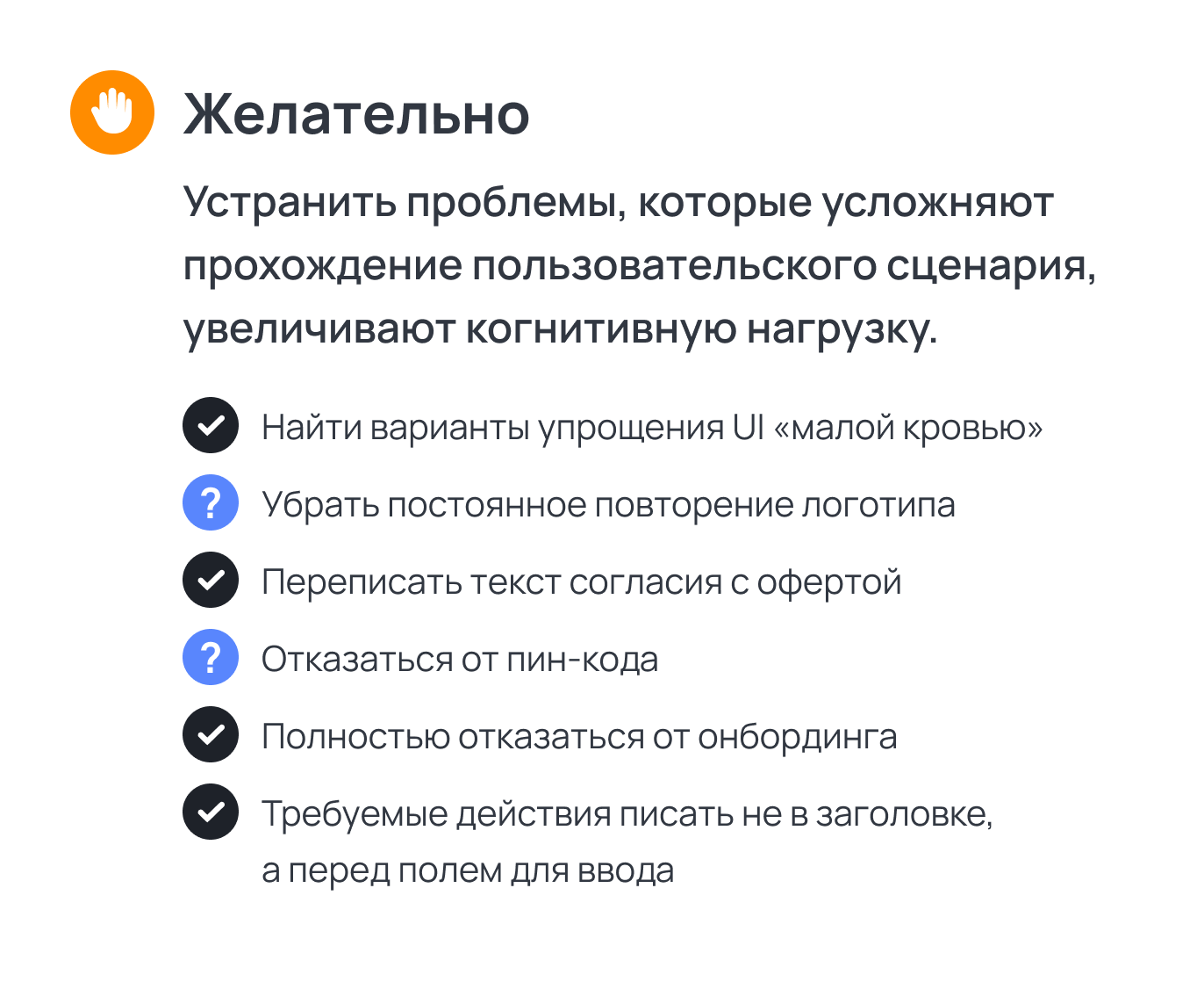 Во-вторых, мы, как и собирались, приоритизировали проблемы, найденные в рамках экспертного аудита. Взяли топ-3 в проработку. Прорабатываем их как с точки зрения интерфейса, так и с точки зрения внутренней кухни, которая за фасадом (это самая сложная часть).