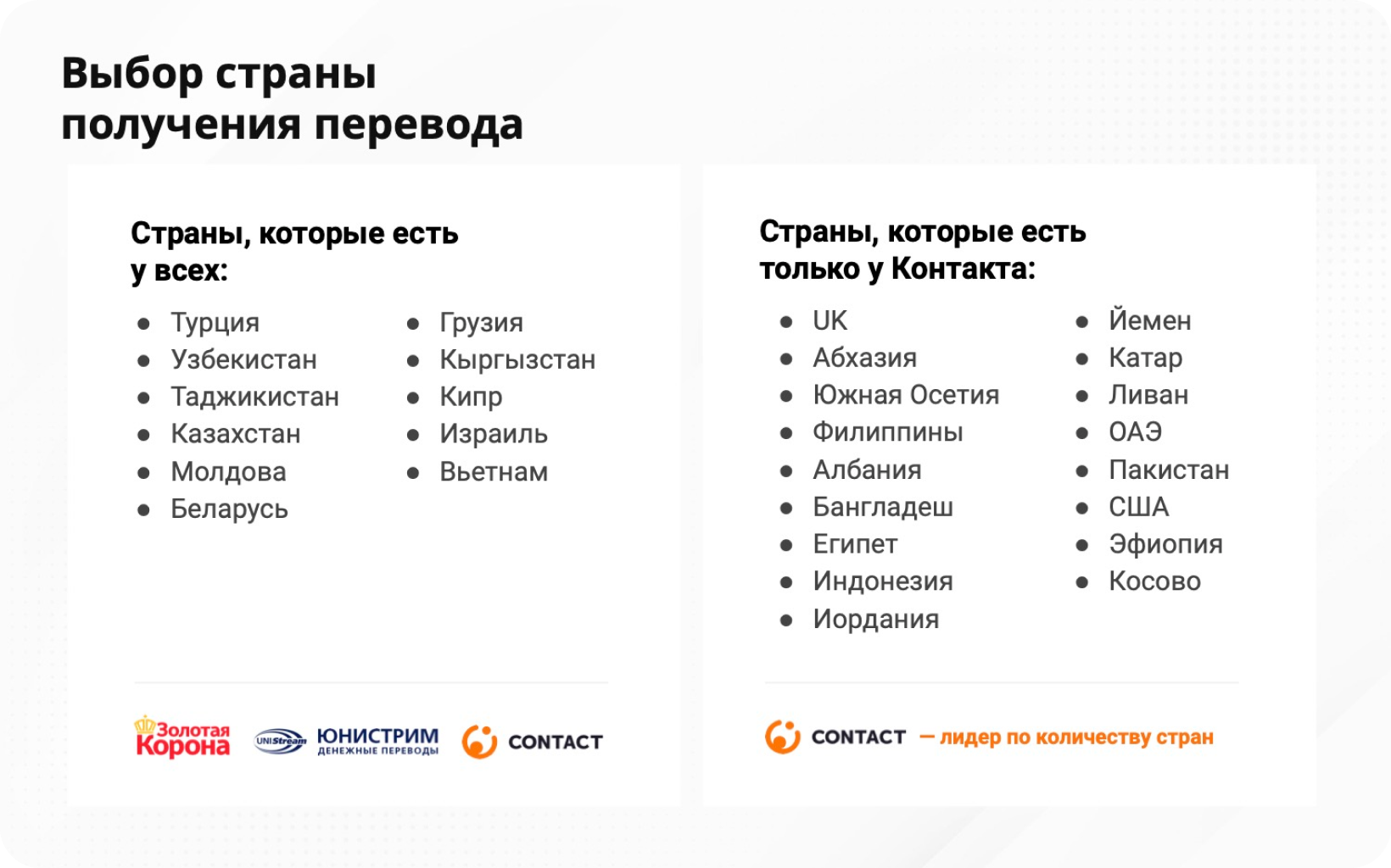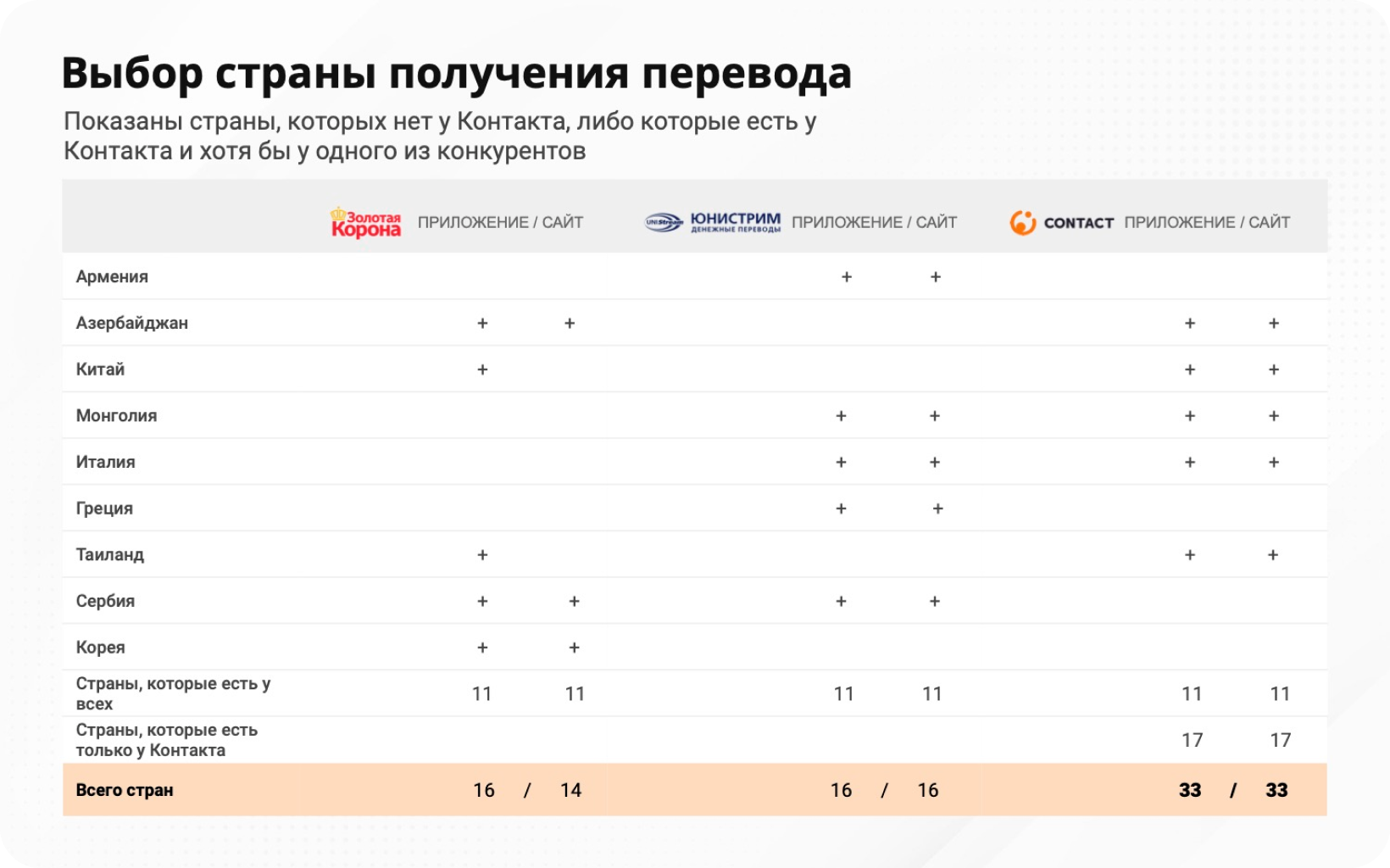 Провести сравнительный аудит сервисов по переводу денег CONTACT и двух ключевых конкурентов.