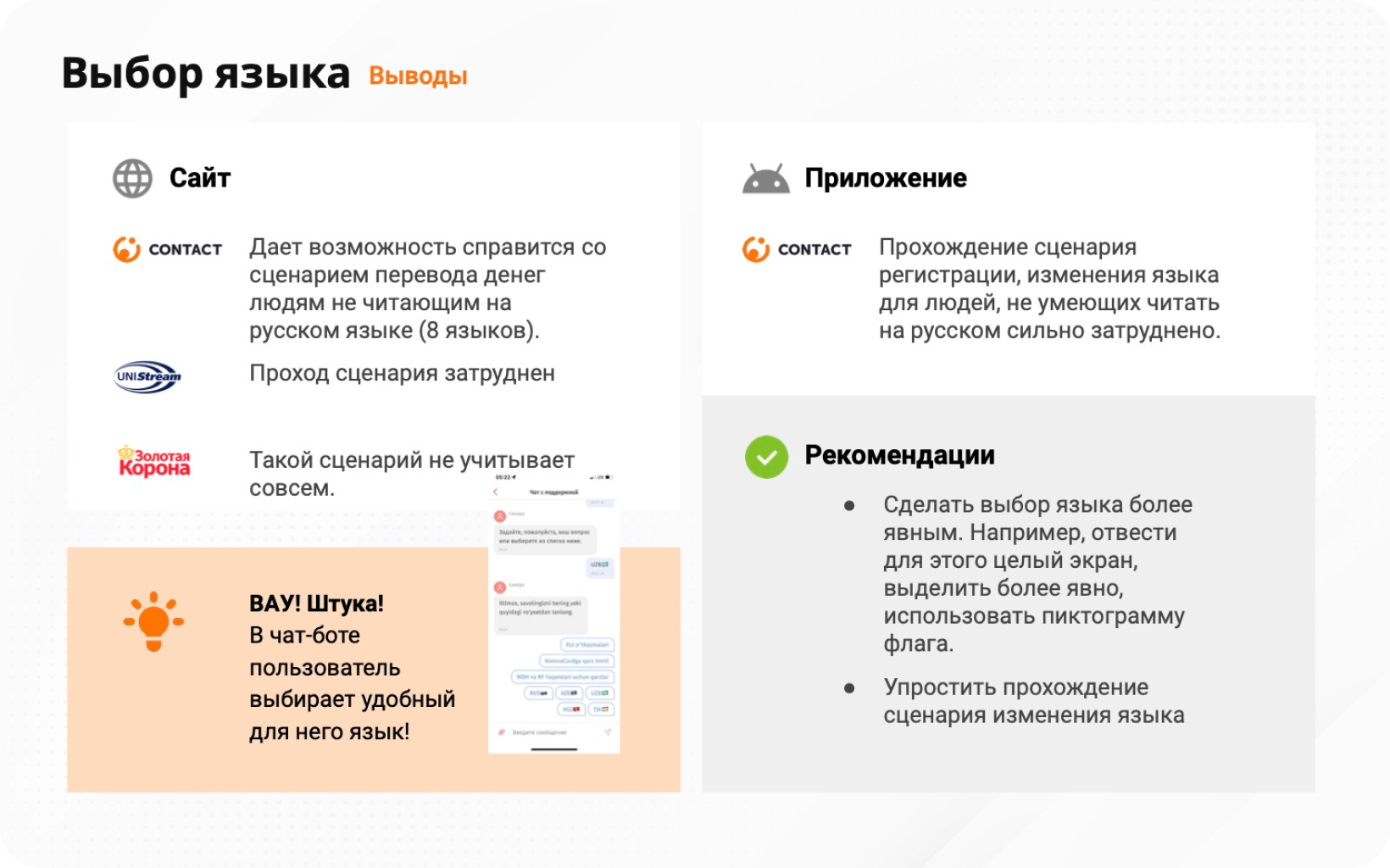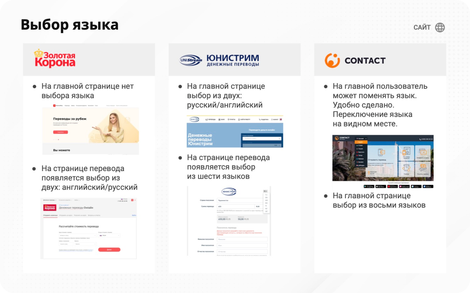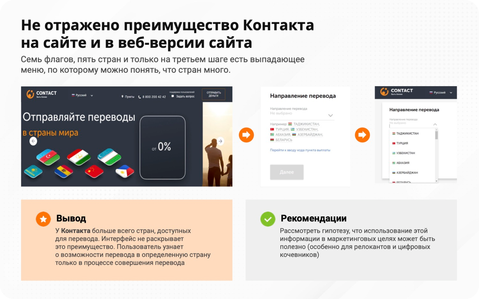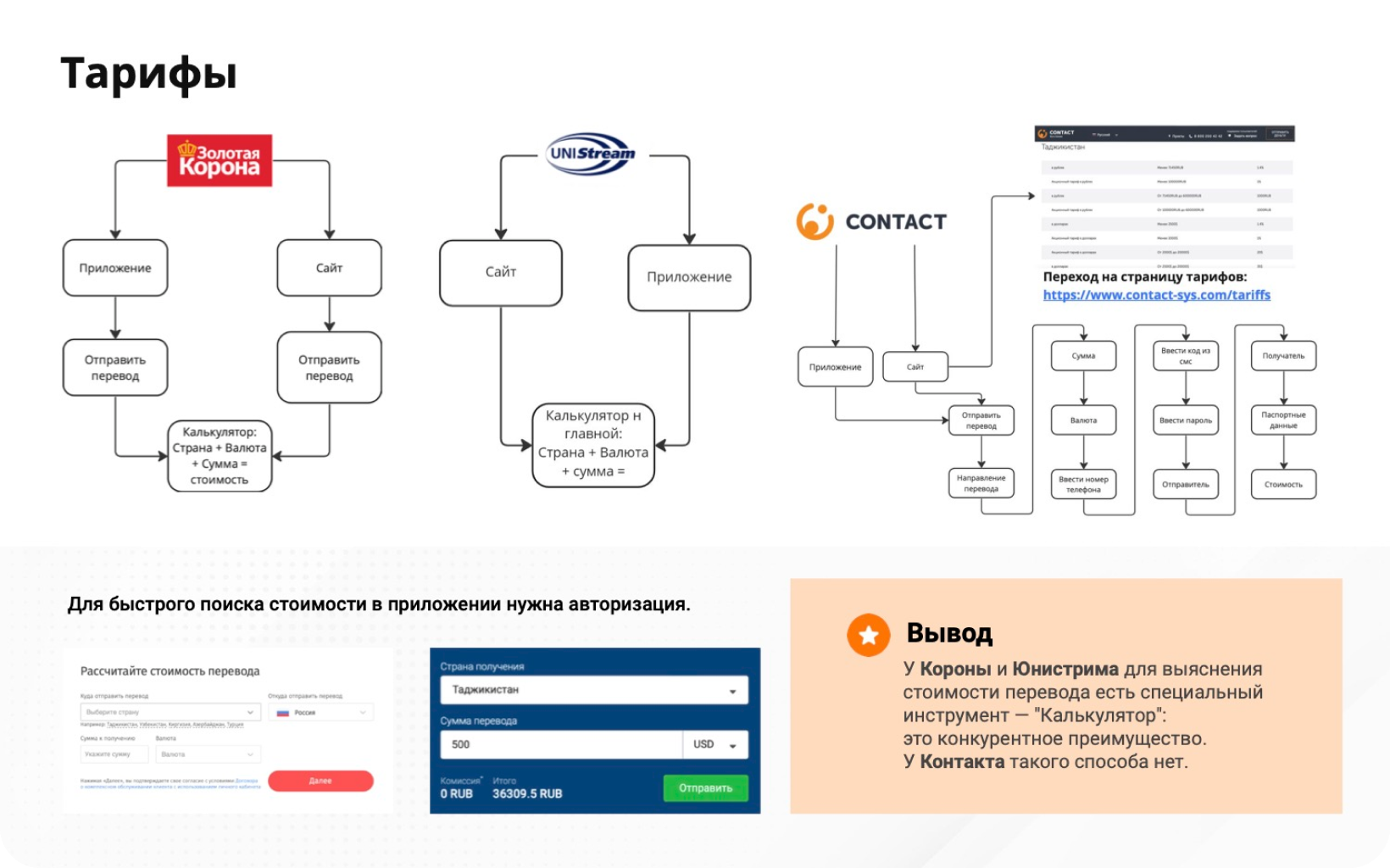 У всех трех систем денежных переводов — похожий набор и последовательность шагов для пользователя. В финальном отчете мы представили пошаговое сравнение с выводами и рекомендациями по каждому шагу.