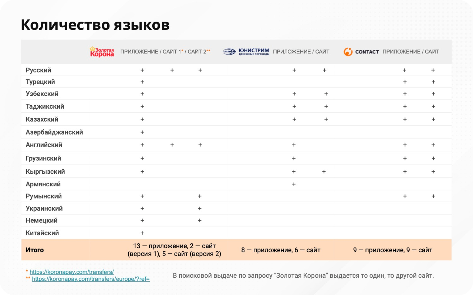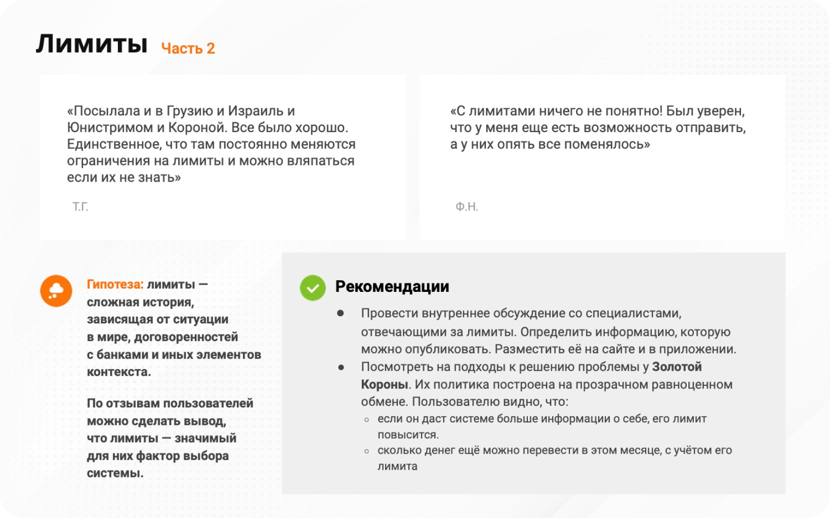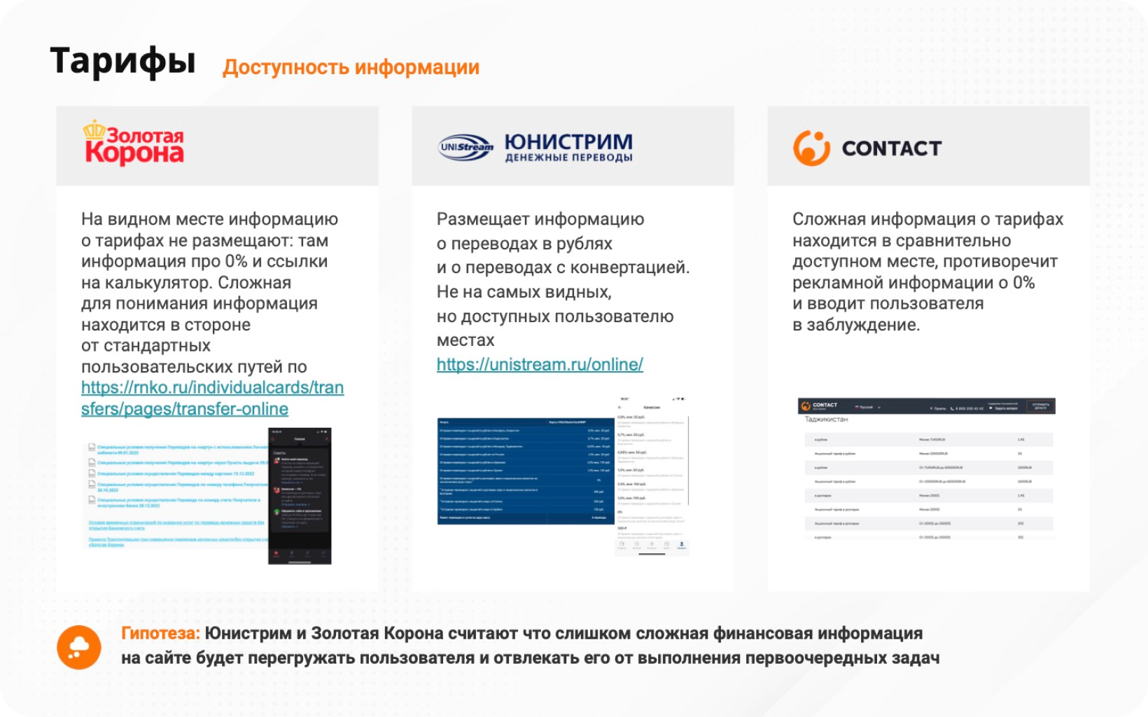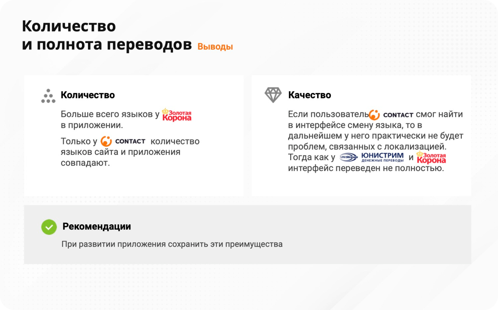 У всех трех систем денежных переводов — похожий набор и последовательность шагов для пользователя. В финальном отчете мы представили пошаговое сравнение с выводами и рекомендациями по каждому шагу.