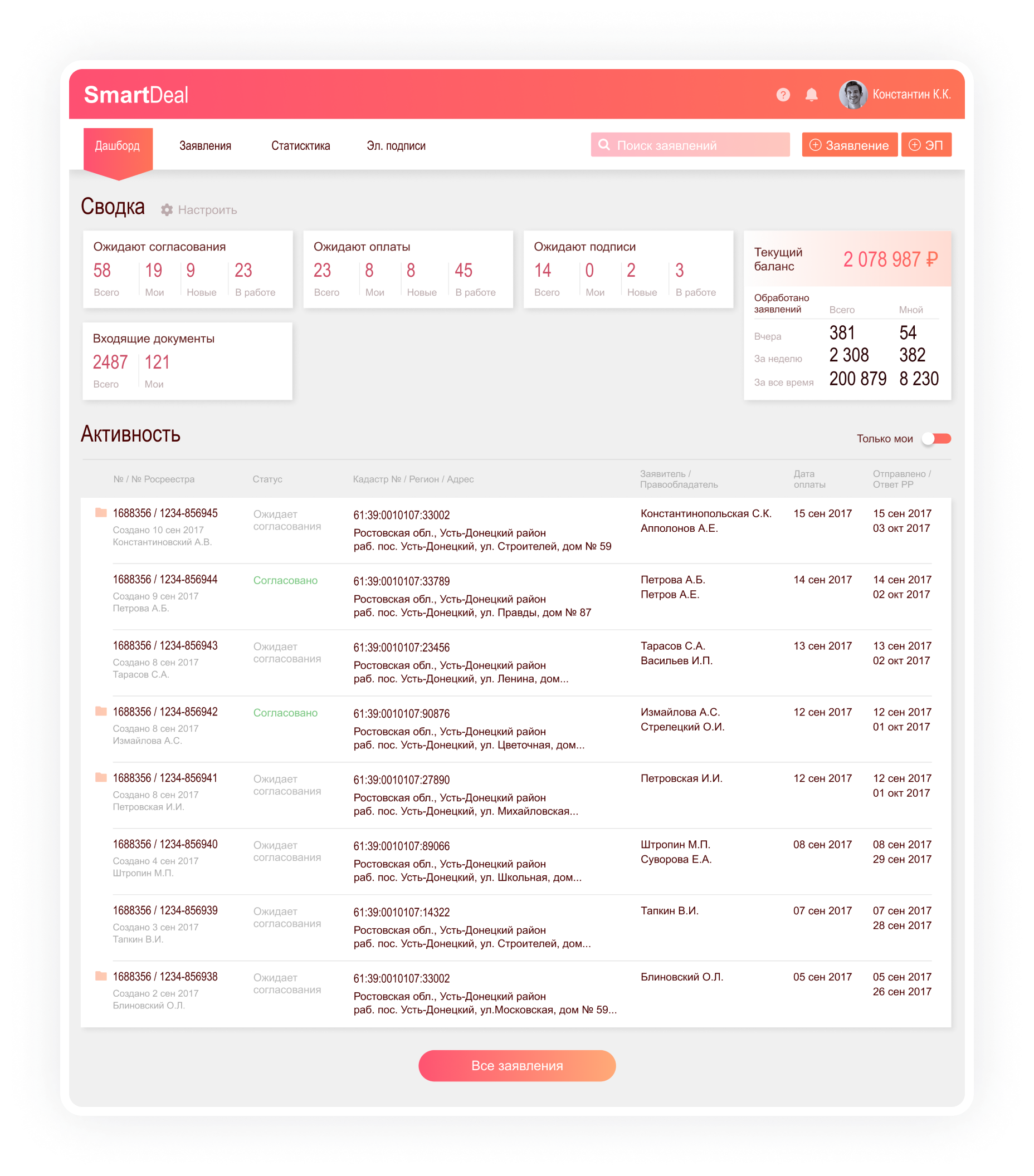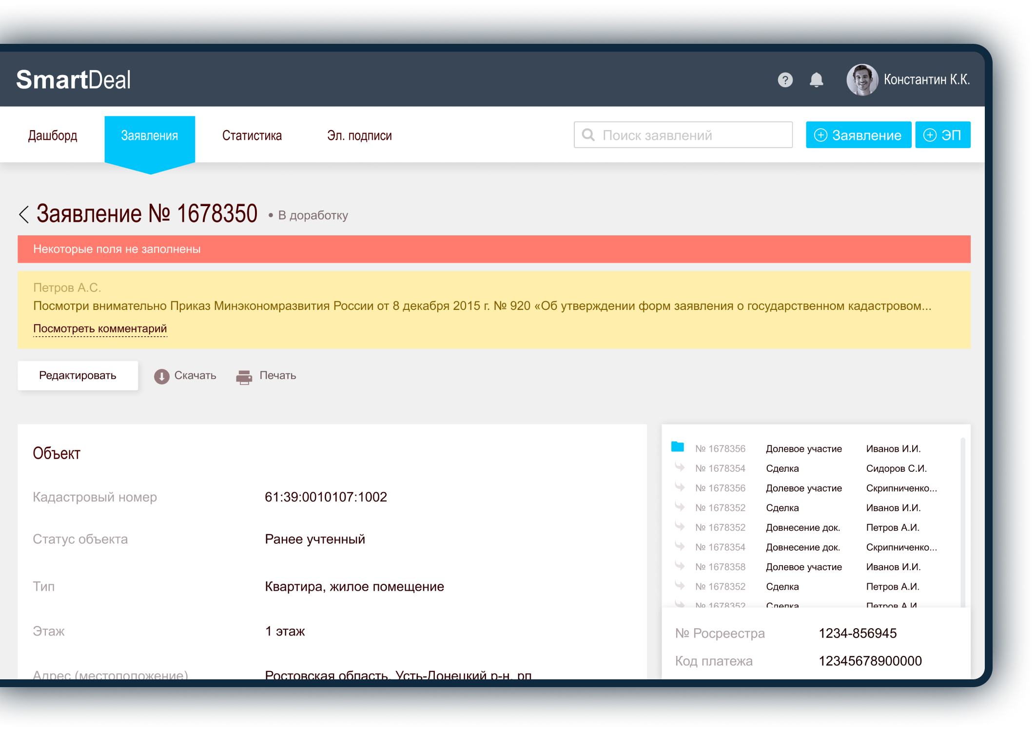 Наш заказчик решил исправить эту ситуацию и разработать профессиональный сервис для работы с заявлениями в Росреестр.