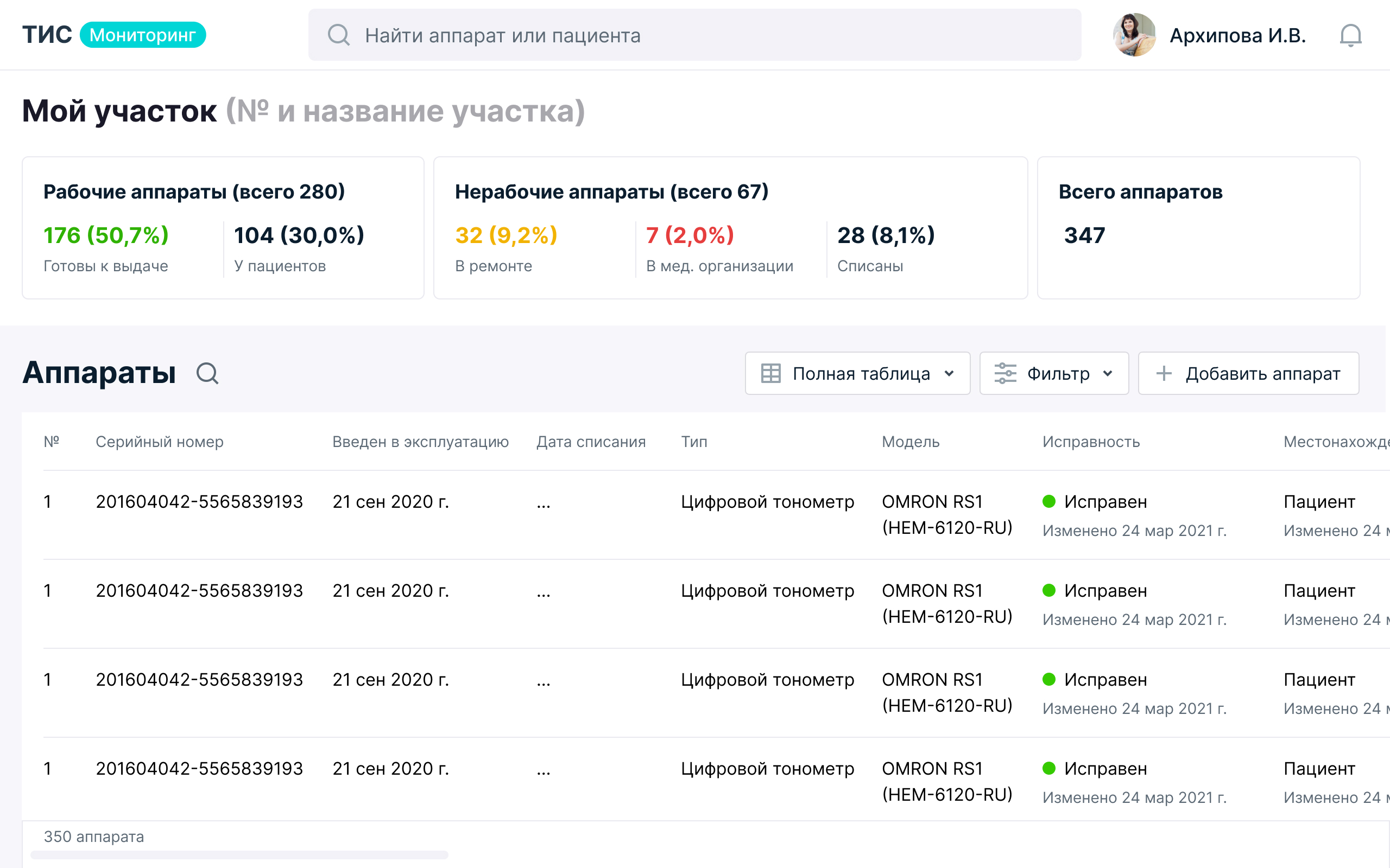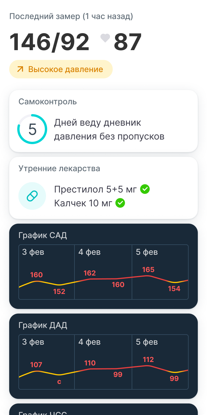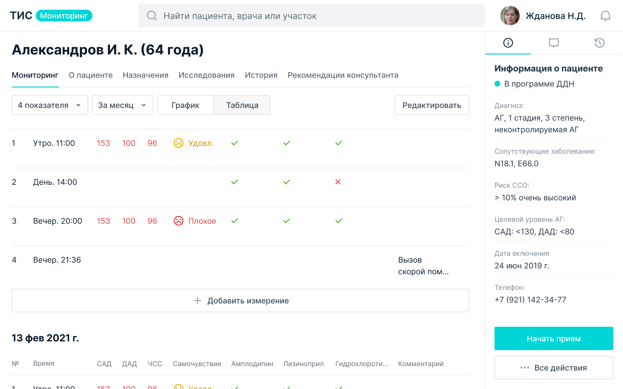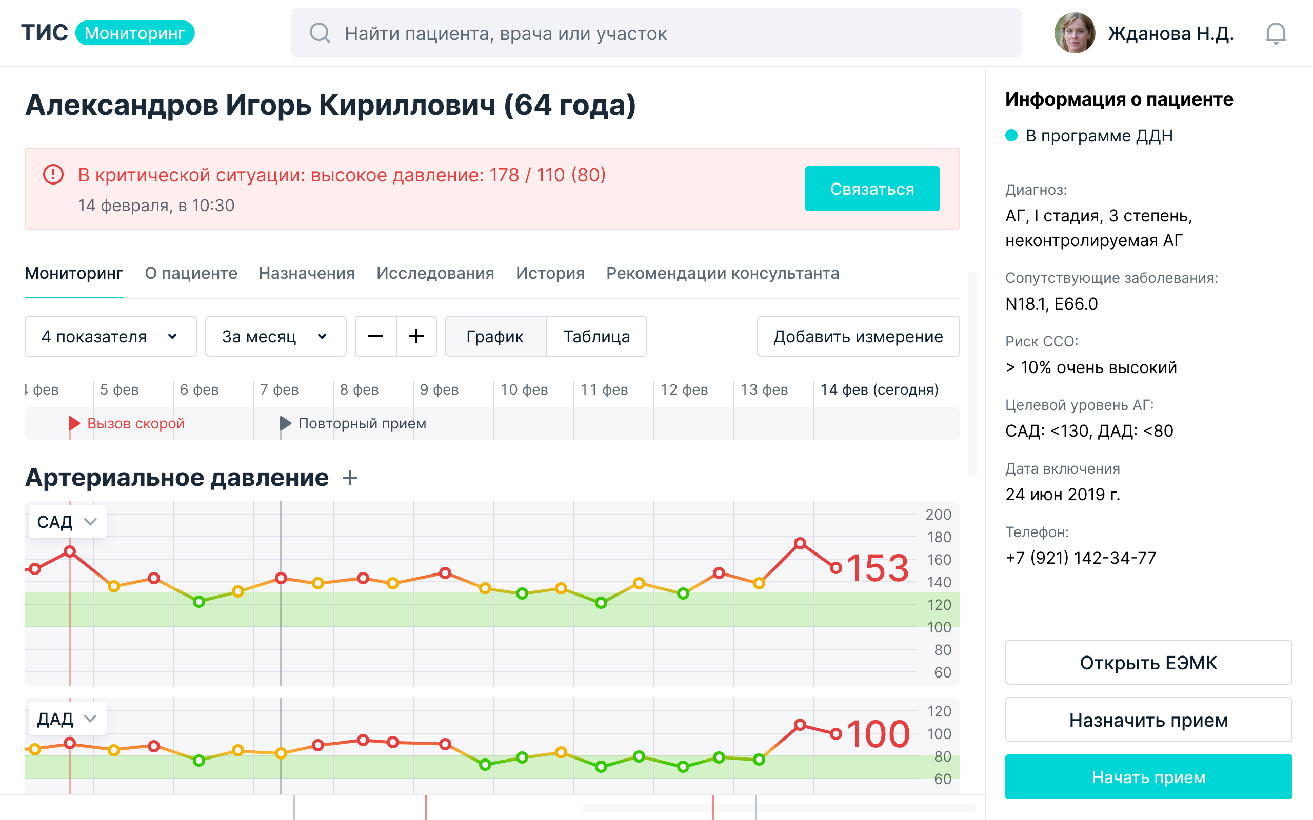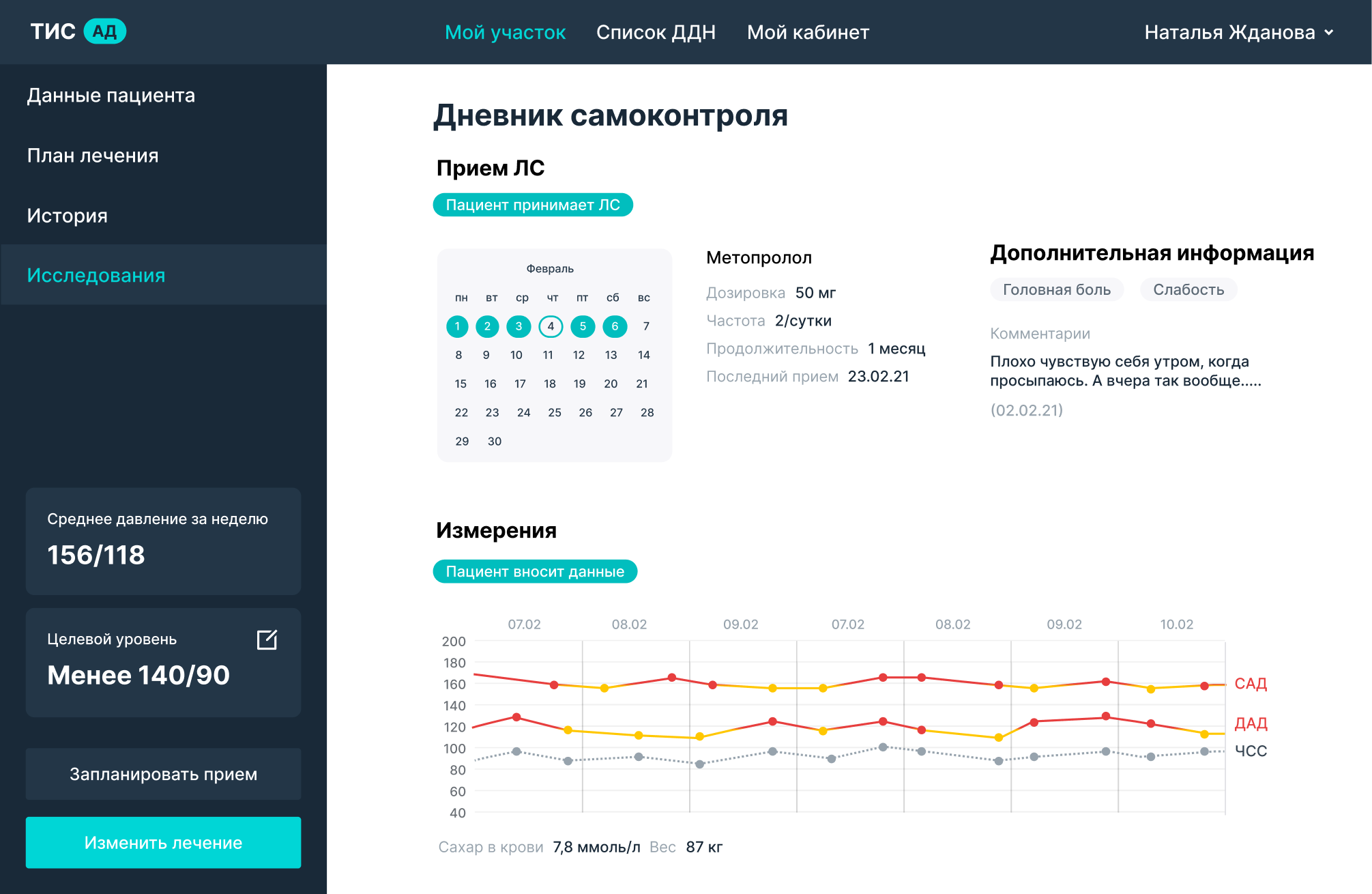 Она взаимодействует с его мобильным приложением, в нее попадают все результаты измерения давления. По ней врач будет дистанционно наблюдать и корректировать процесс лечения. Динамику изменения давления покажут графики.
