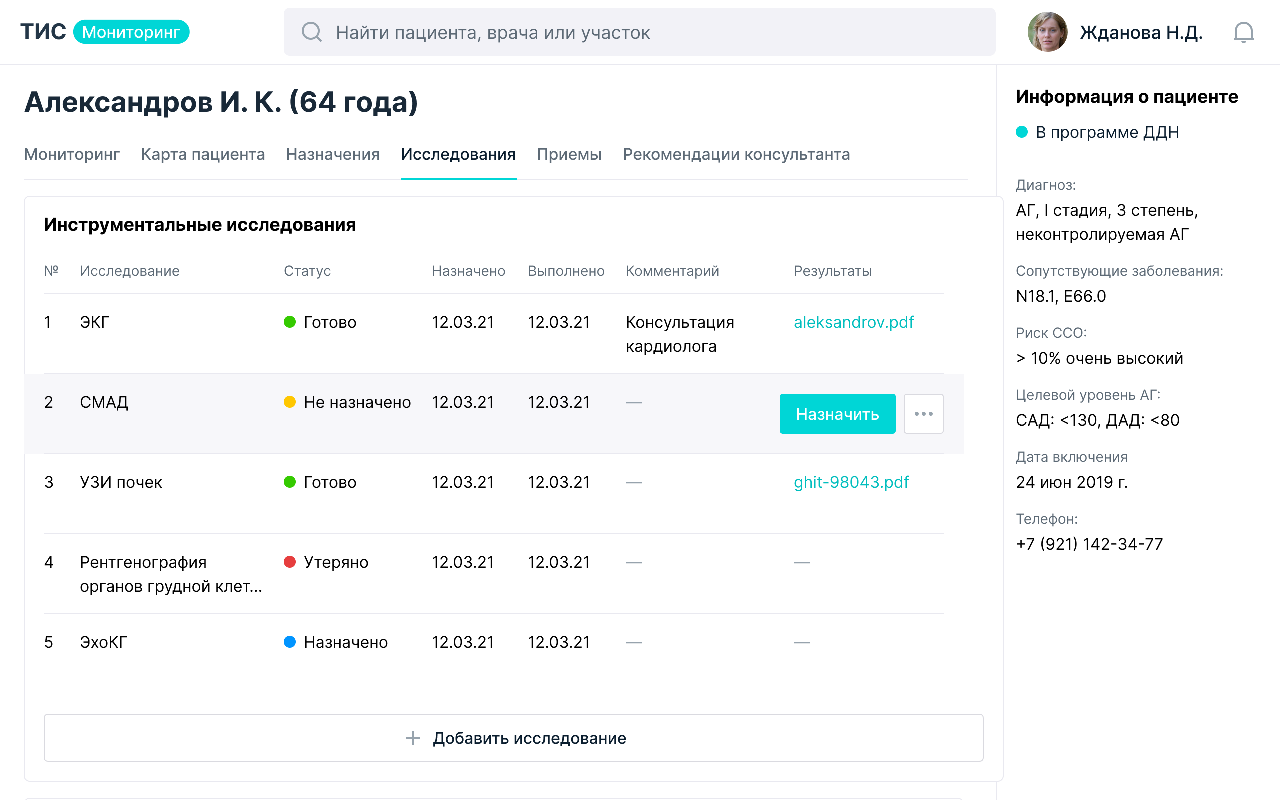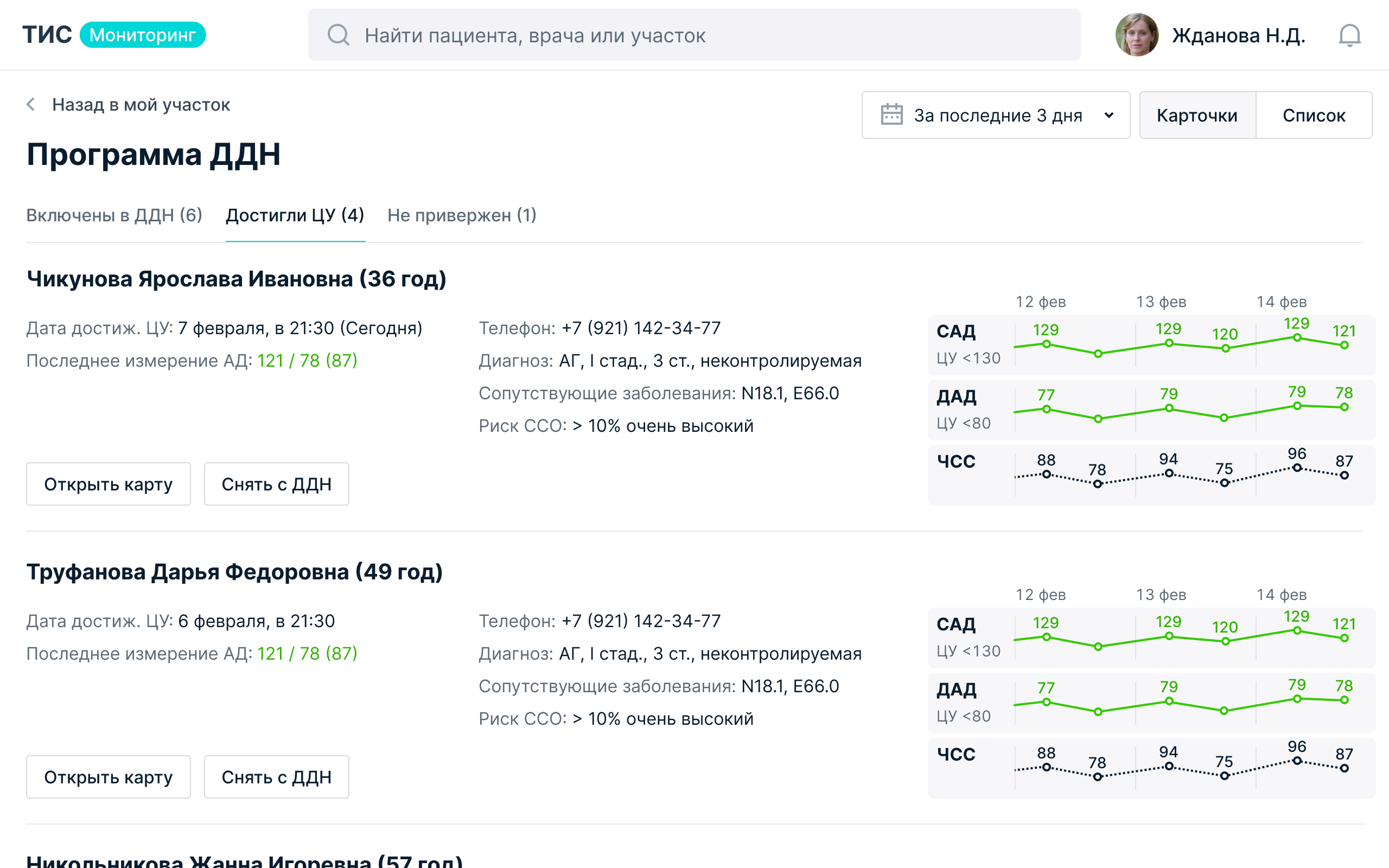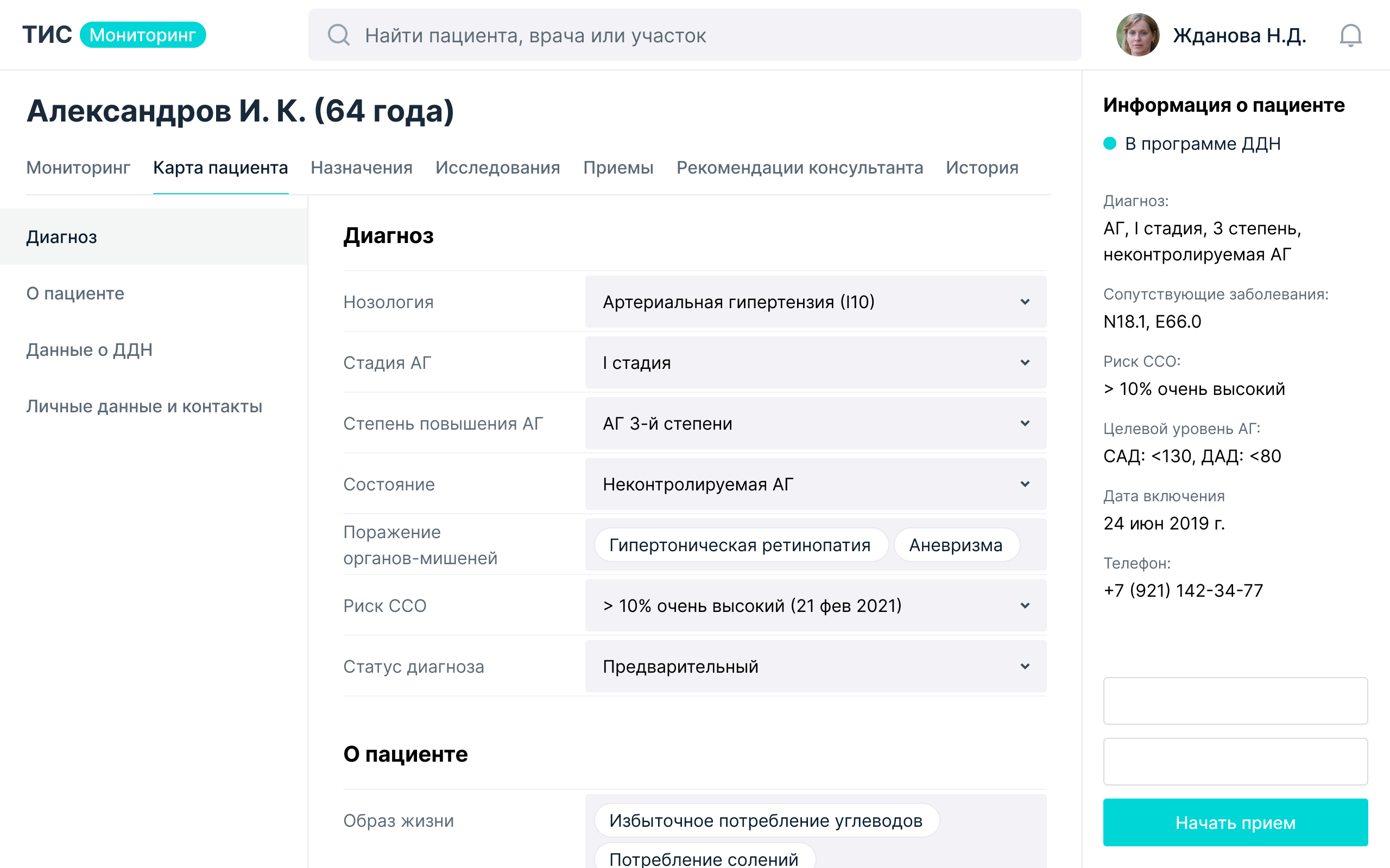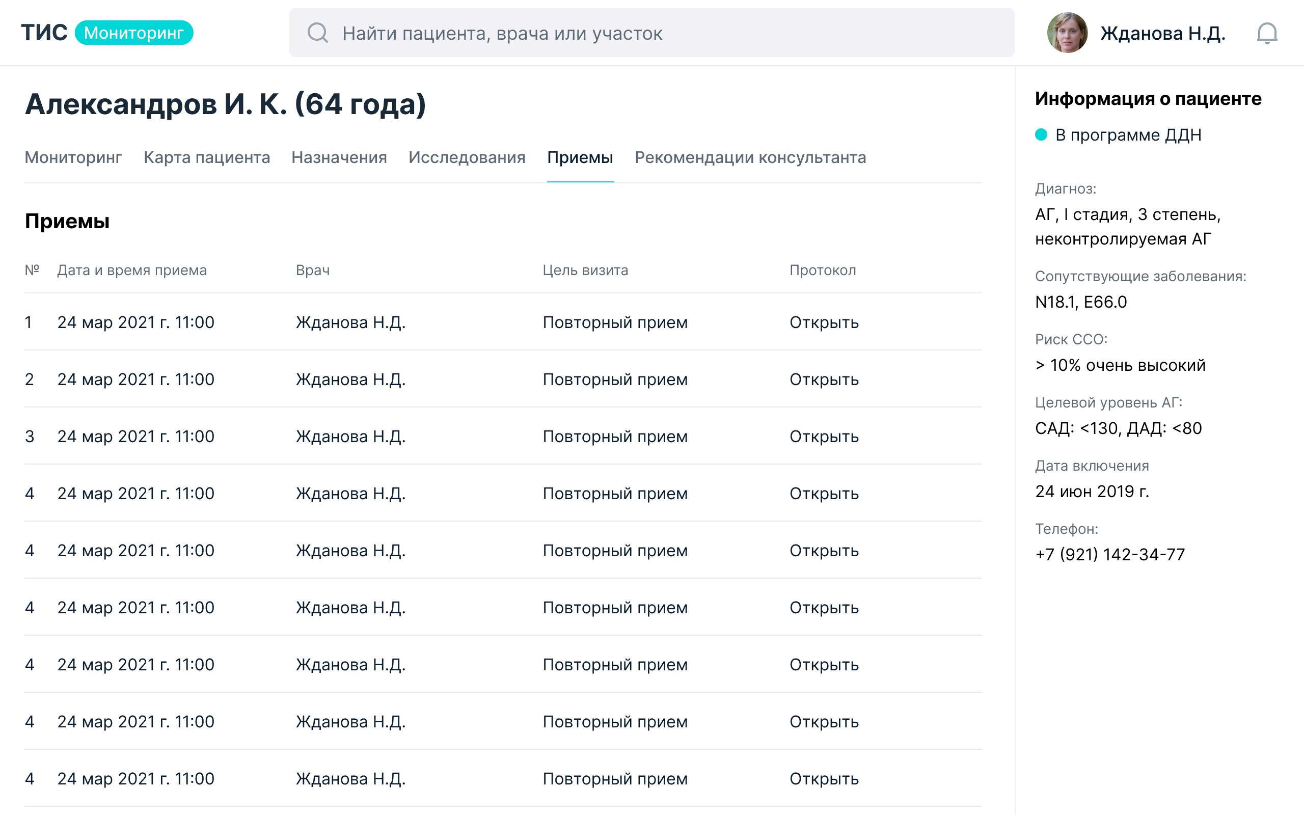 Он отобразит всех пациентов врача с указанием уровня сердечно-сосудистого риска. Позволит вовремя изменить терапию, в критической ситуации – госпитализировать.